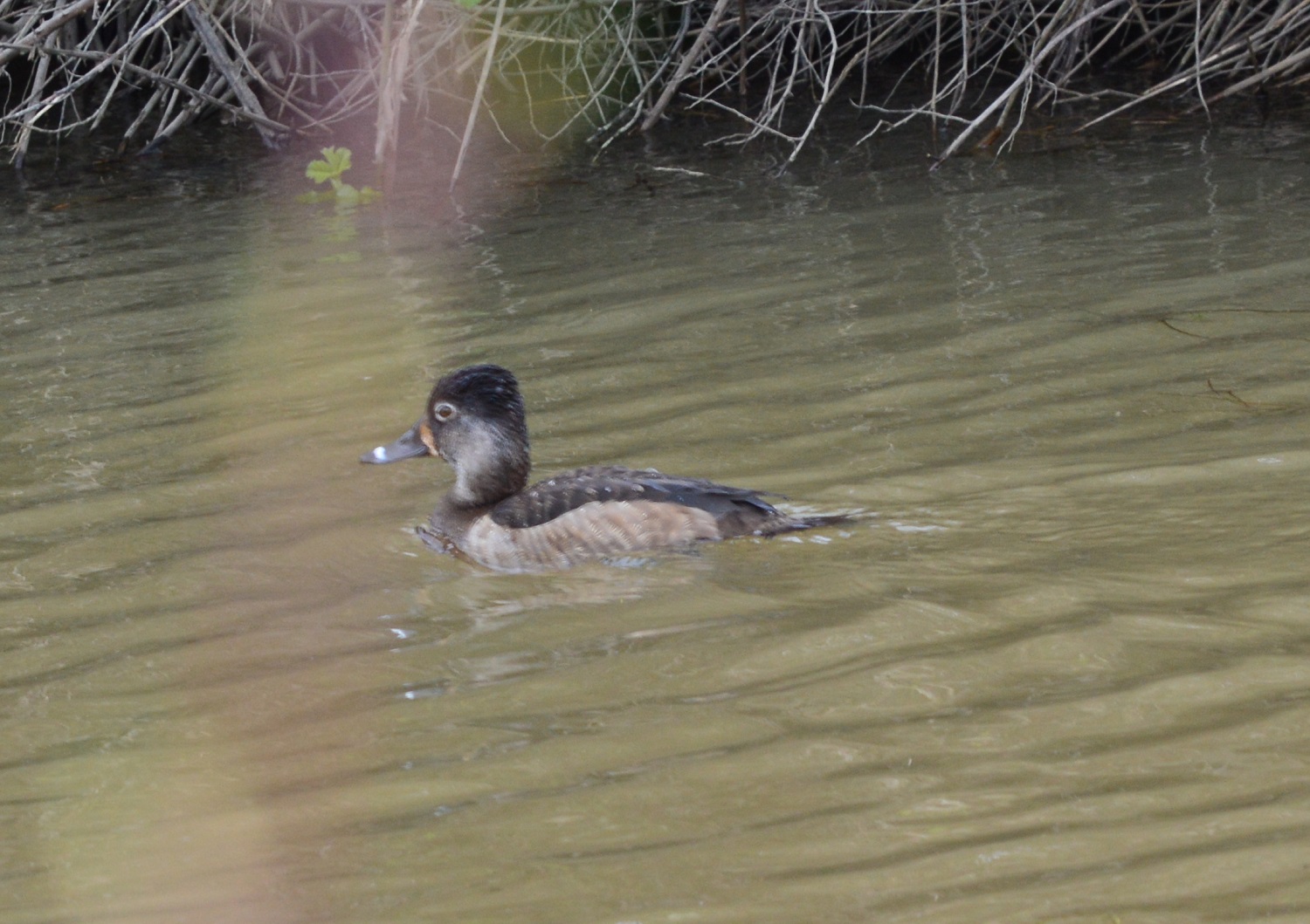 As we continued to walk down the Garden Trail (at Colony Farm Regional Park) there were three ducks hanging out together, all different types. The first one that I noticed was a female Ring-necked Duck. Unfortunately she was swimming away from me a little too fast and couldn’t quite get a good shot in, hard to get a shot through all that brush at the river bank.
