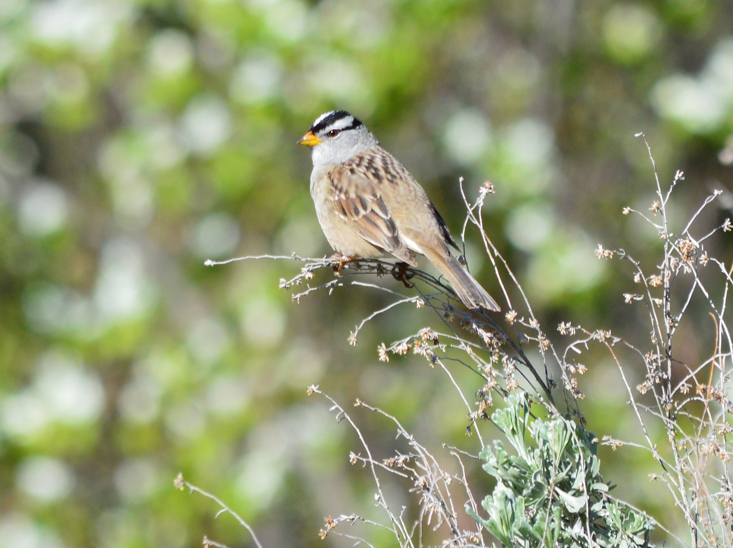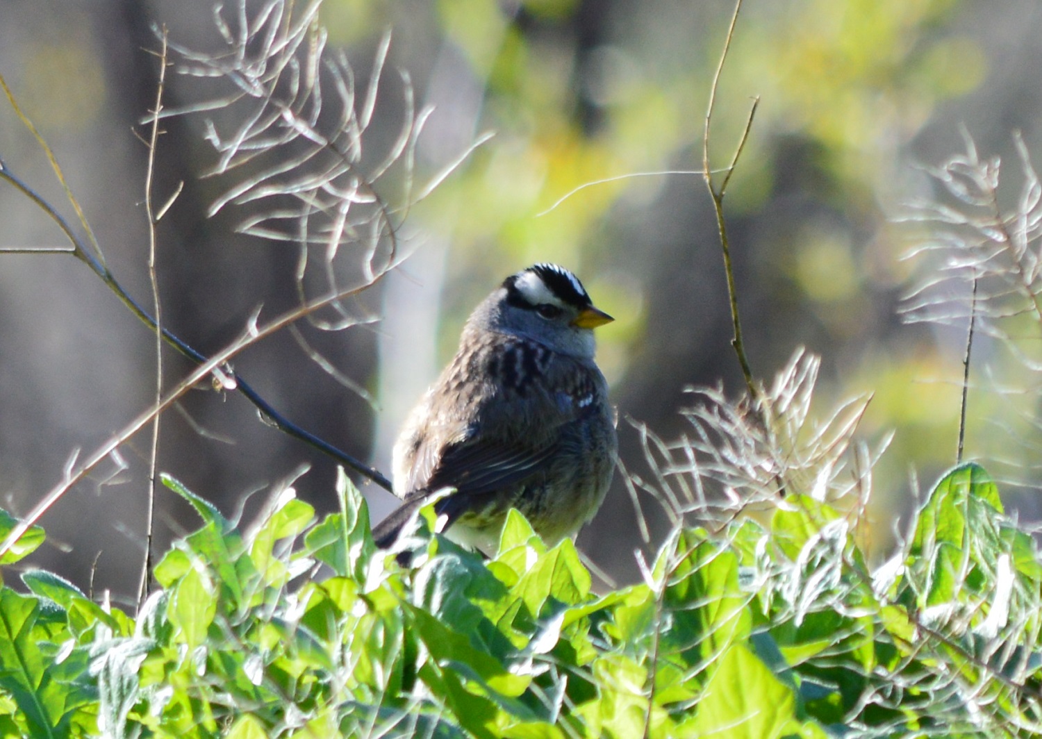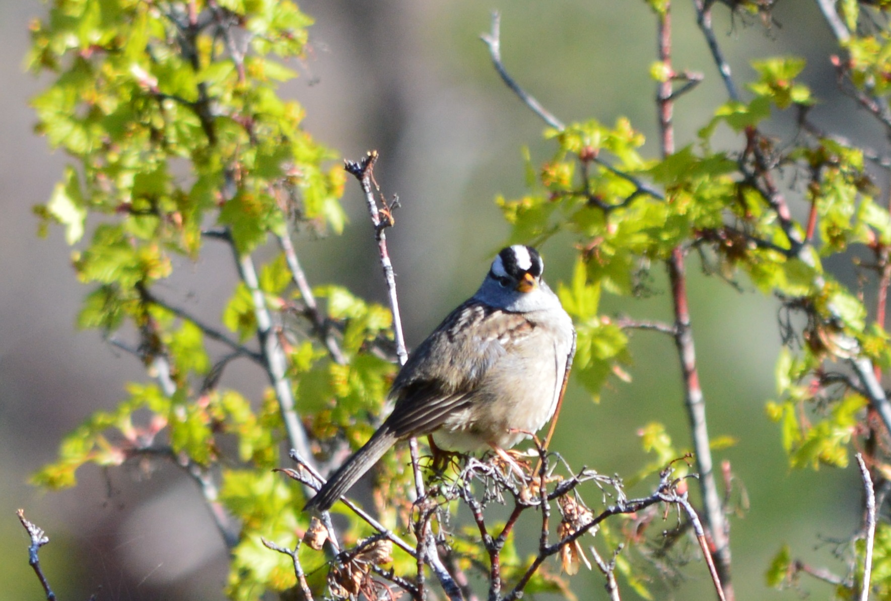 Nice pictures! I like that you captured the bird’s eye details in the last photo :-). And I find the little bits of shrubbery in all the images quite lovely and decorative. White-crowned sparrows are super cute but their heads and bodies do seem to belong to different birds.