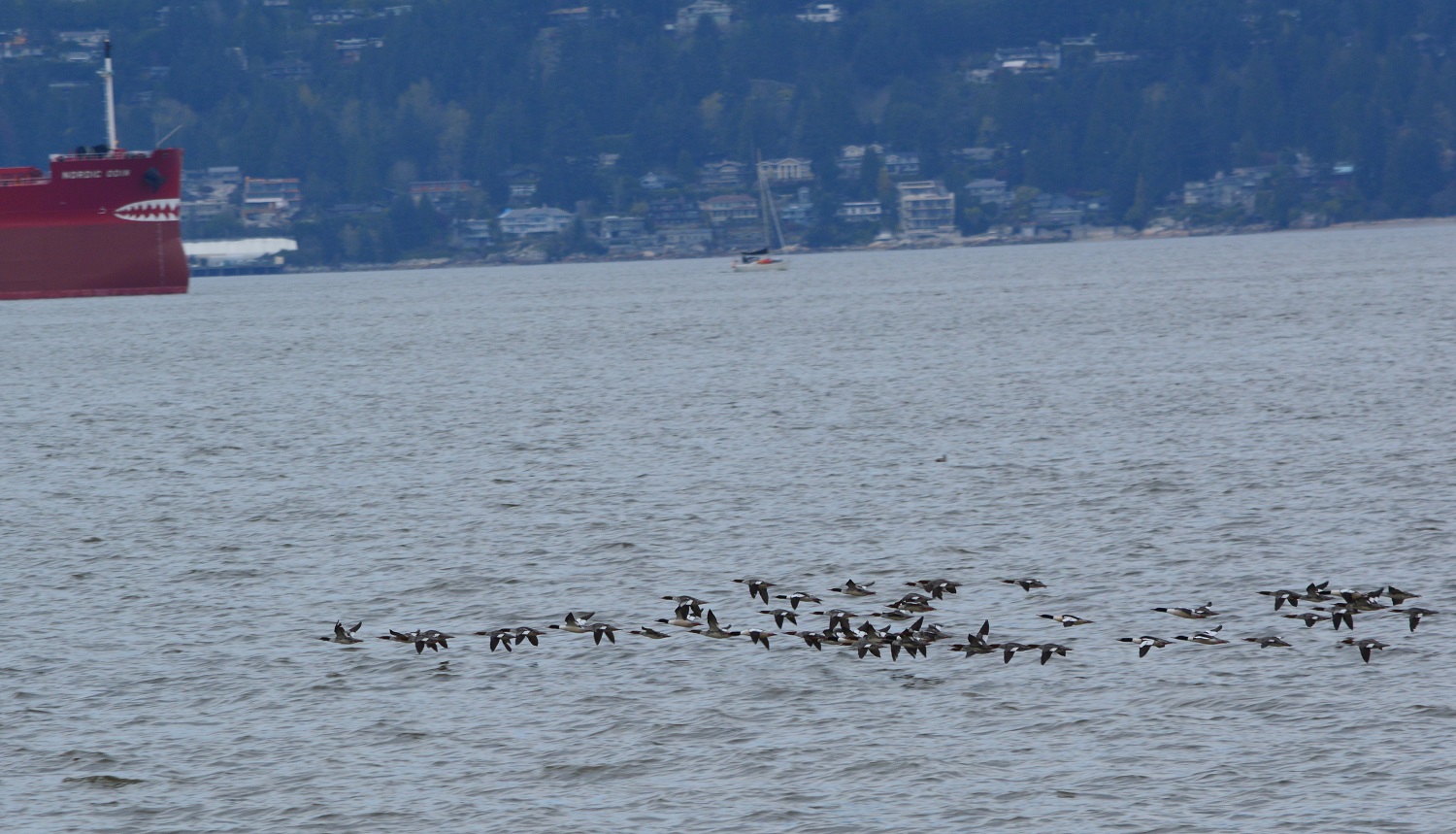 I saw this flock of birds pass by when we were on the pathway (picture below). I have been zooming in on these pics to see if I can figure out what they were, my best guess would be Common Mergansers but am not sure about that.