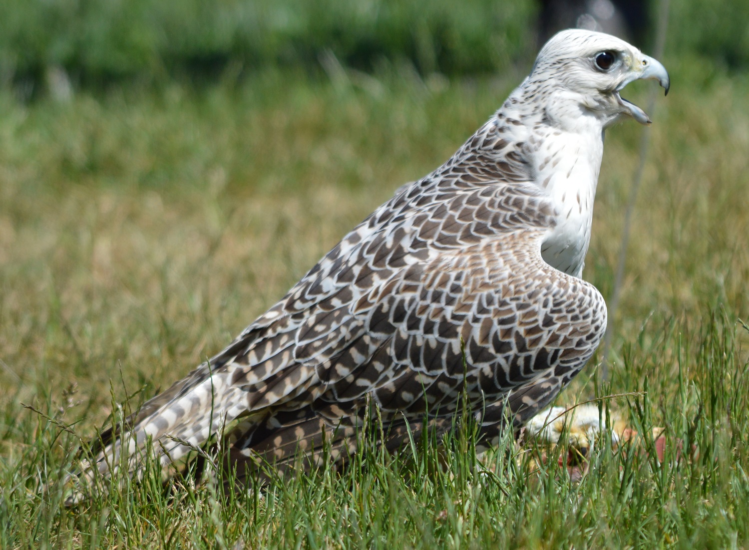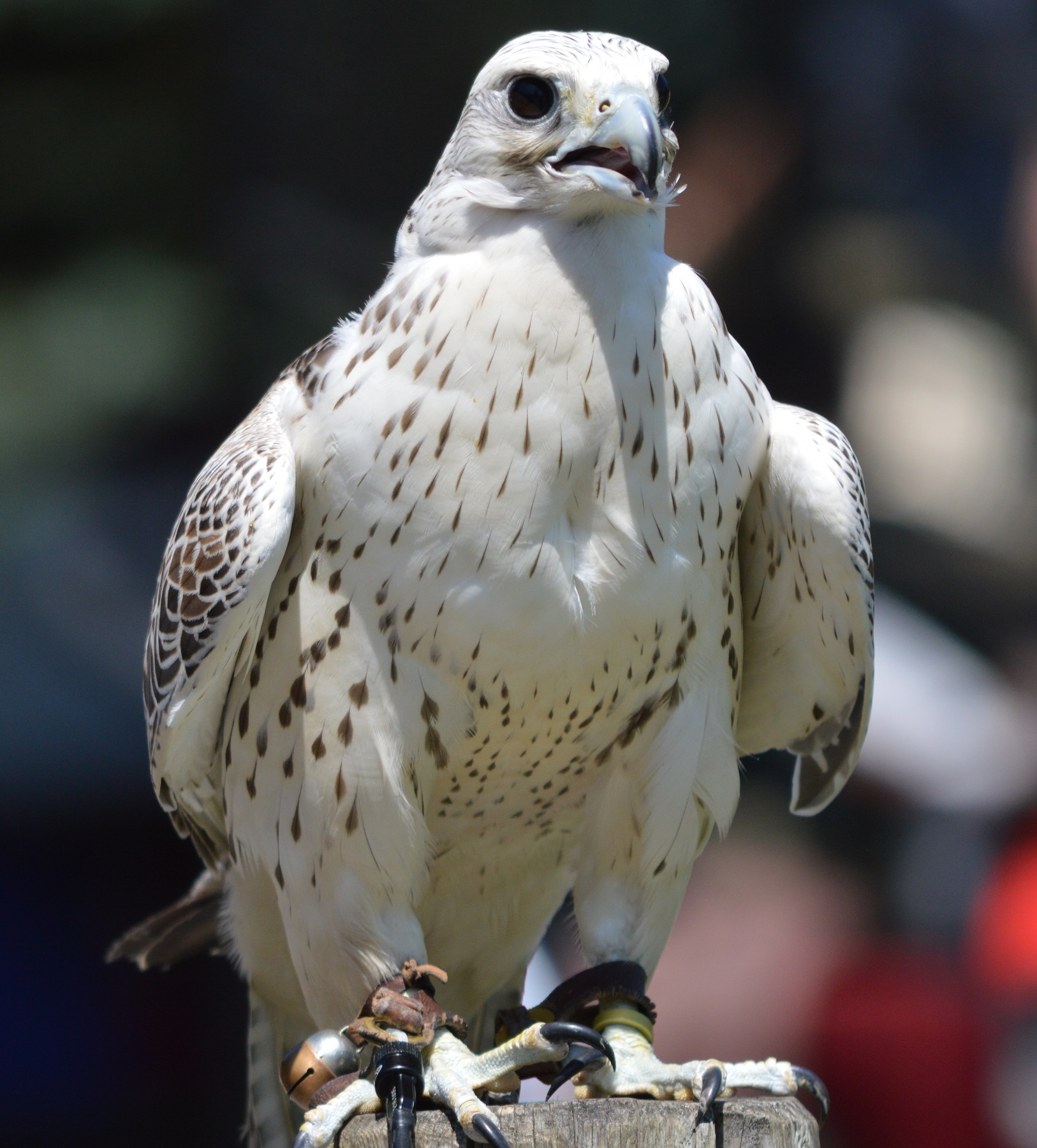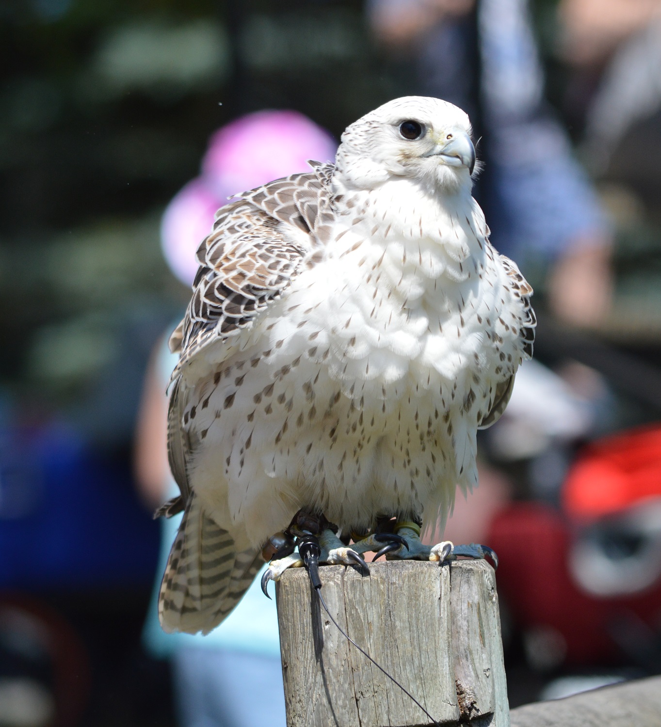 This is part 3 of 3 about the stars of the Radical Raptors show at the Greater Vancouver Zoo. The last bird they brought out was Denarius, a gorgeous Gyrfalcon. In the summer these birds live and breed in the Arctic and Subarctic but in the winter they can be found in most areas of Canada, as well at the northern states of the United States. According to e-bird they have been spotted in the Lower Mainland, primarily at New Brighton park in Vancouver up to about March of this year (I know where I’ll be bird watching next winter).