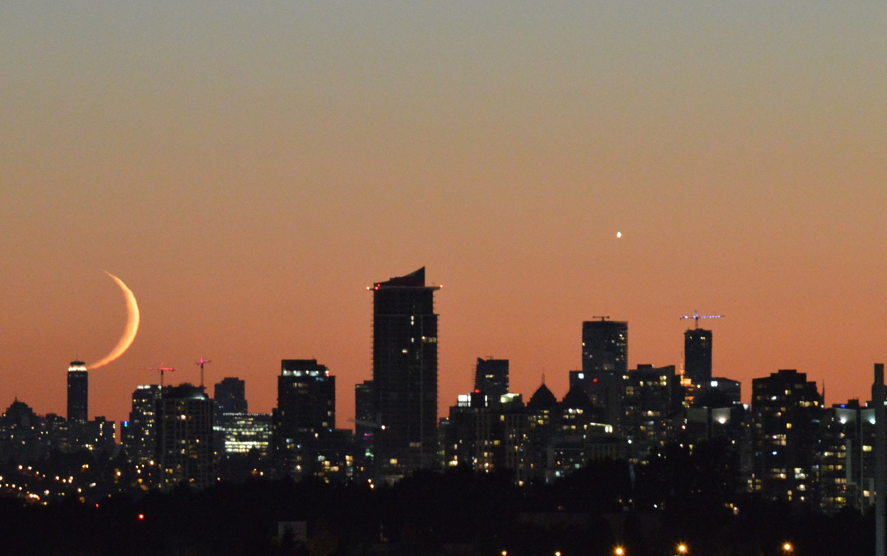 Last night’s sunset (below) was pretty awesome too. I sometimes keep my eye on the moon rise/set times so I can get a shot with it nice and big as it’s close to the horizon. Plus it’s an added bonus when the moon setting time corresponds with the sunset. Friday night’s sunset caught be a bit by surprise, but I set up for last night’s sunset and stood with my tripod on the balcony and snapped shots as the moon was setting. I believe that Venus is that bright spec to the right.