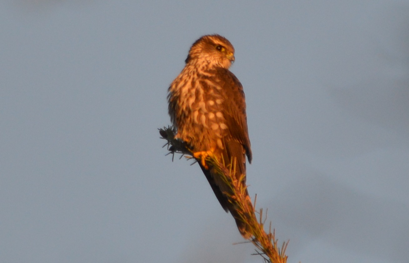 I’m pretty sure this little bird or prey is a Merlin, almost just based on it’s size alone. Plus the white eyebrow is a give away.