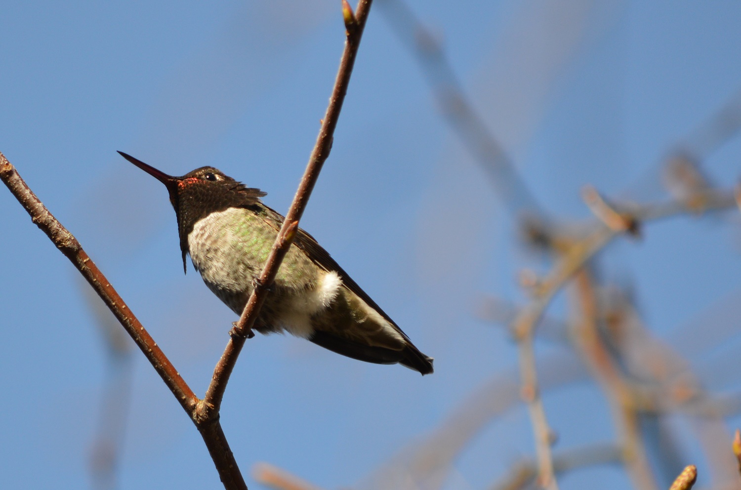 When we went to Stanley Park in February we ran across this little Anna’s in the picture above it was doing some great aerobatics where it would shoot up high in the sky, and then come dive bombing down which resulted in a sound that was created by their tail feathers. According to allaboutbirds.org this behavior was his courtship display. I lucked out and managed to catch him perched on a branch while he caught his breath.