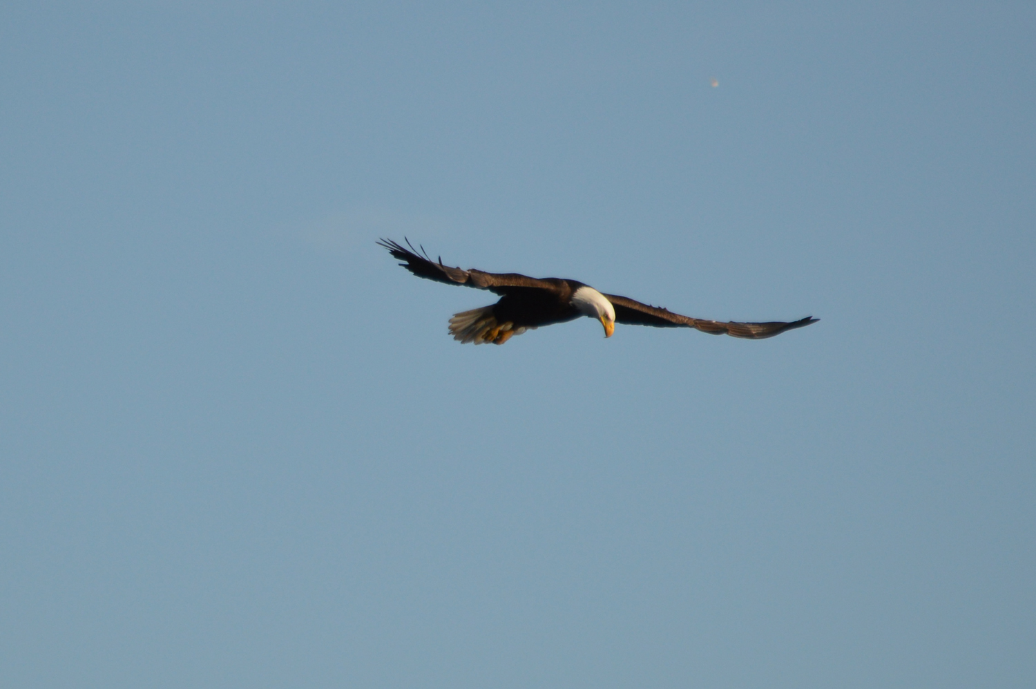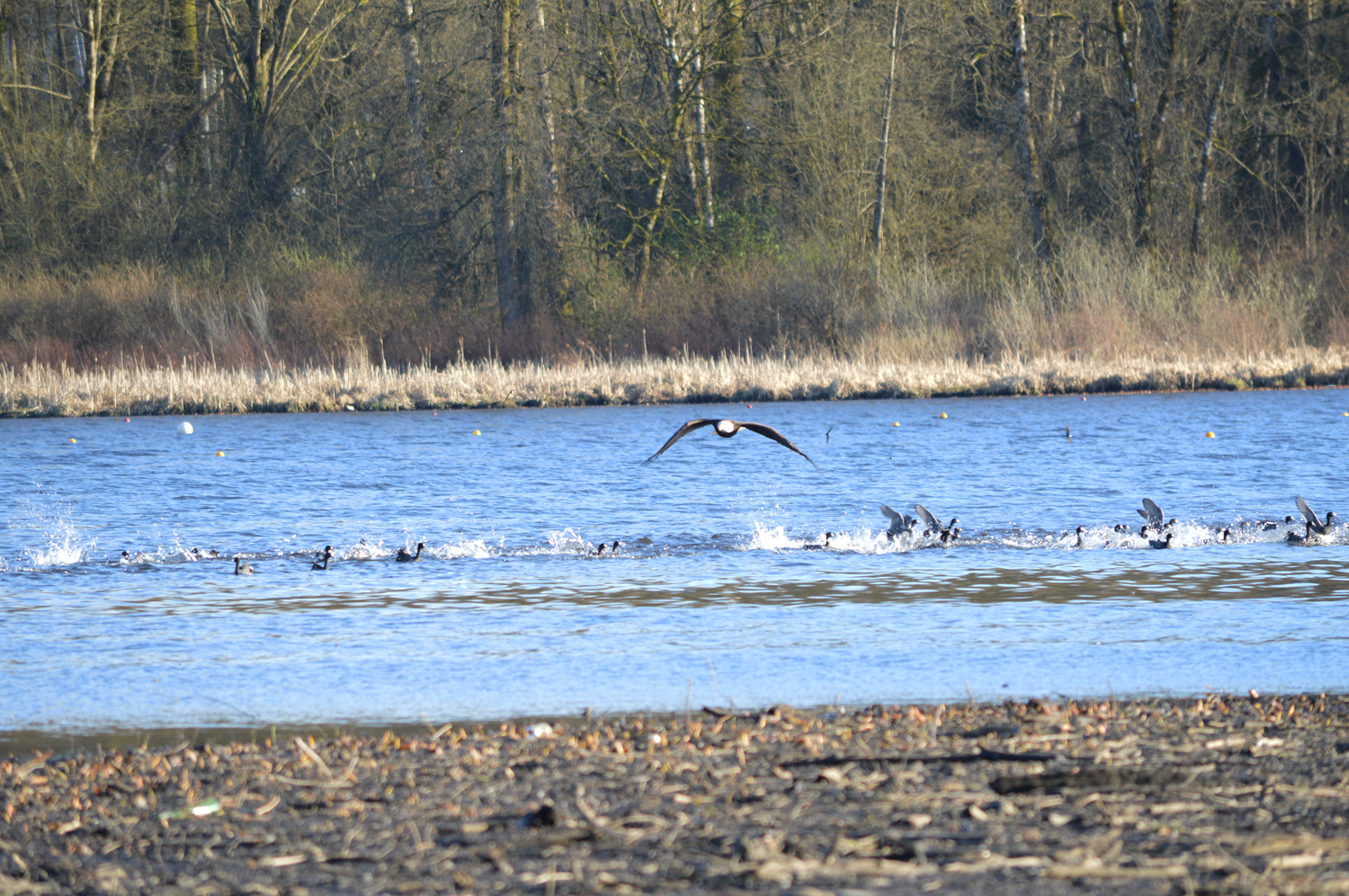 First I saw a group of Coots who were swimming like a little black cloud, all clustered together. I’d never seen them huddled like this before, usually they’re all scattered around. With my eyes still on the Coots they all of a sudden started scattering. Then the eagle came into view as he did some low pass-by’s right over the heads of the Coots. I’d never seen this type of activity before, but it went on for about 5 minutes. I was quite a distance away and so didn’t get as clear pictures as I would have liked, plus I was on a little pier that kept moving as people were walking around on it.