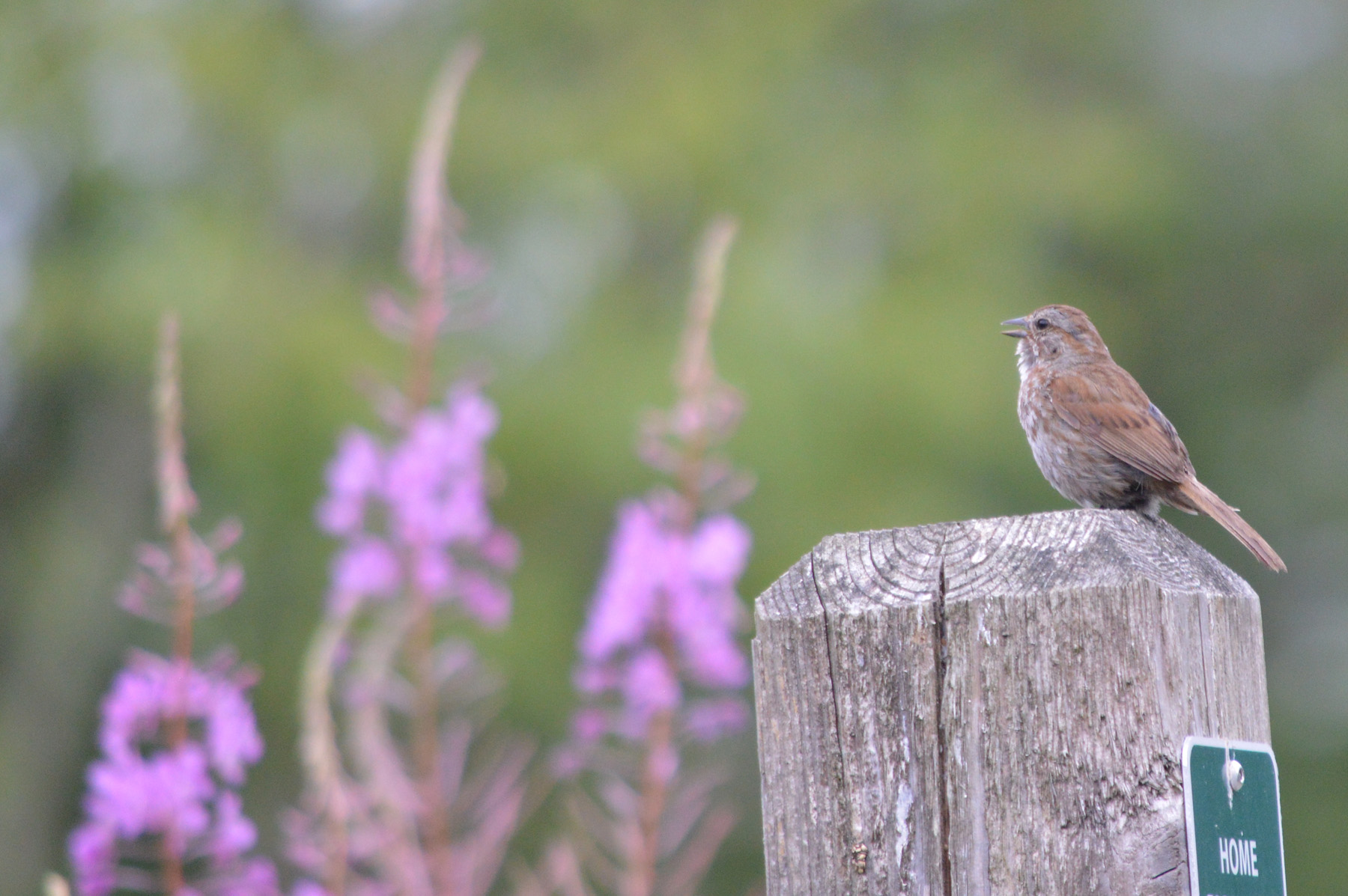 One of the proud members of the Little Brown bird club ~ or as I saw on wikipedia “LBJ ~ Little brown job”. Song sparrows bring to mind an image like the one below, captured last summer. Cute little bird on a perch, singing it’s song for all to hear.