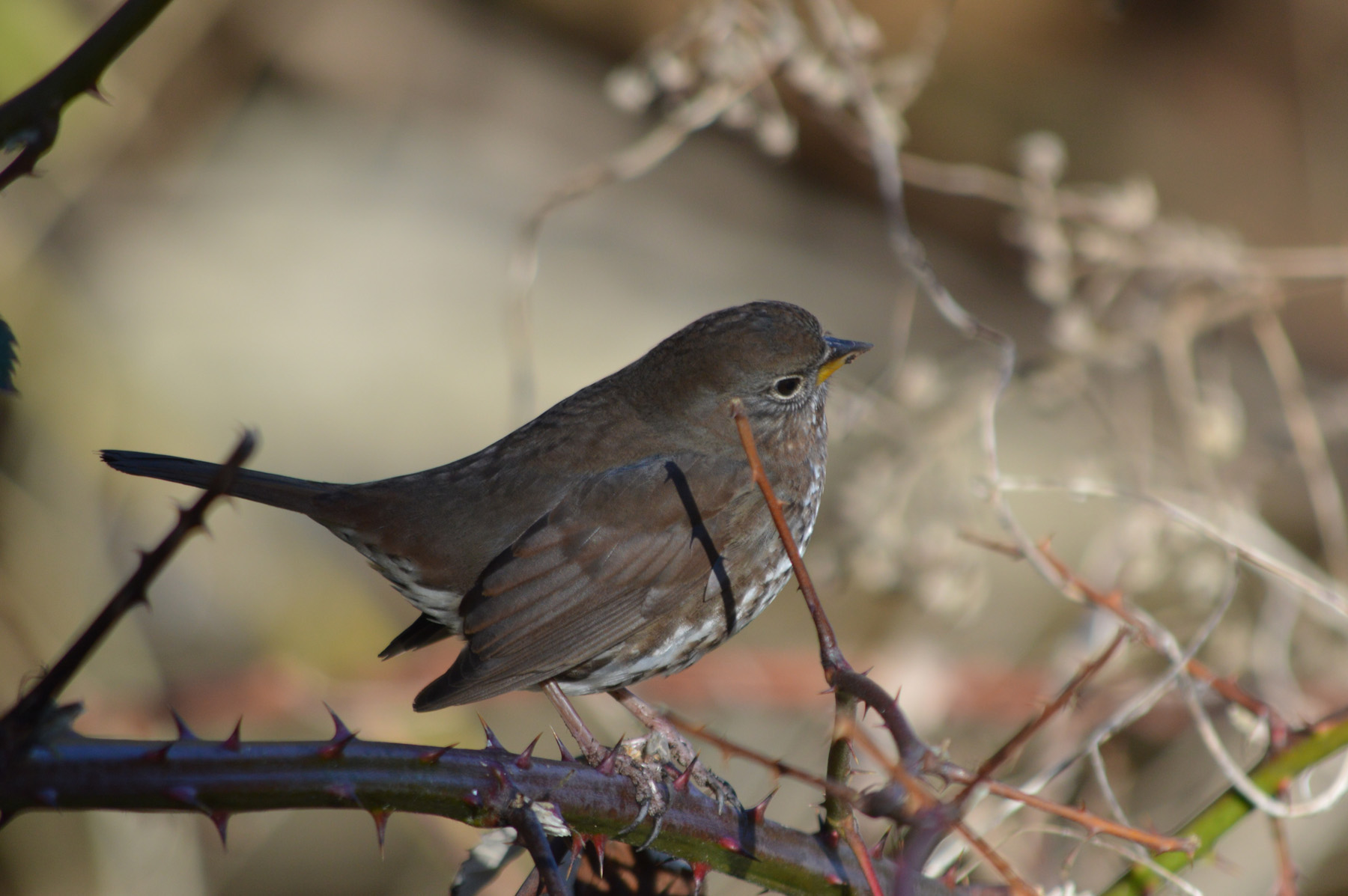 I usually find the Fox Sparrow on the ground, in the brush scratching through the leaf litter. They tend to blend in pretty well with their background which I find makes them seem a little more scarce than their “Song” cousins. On this day I was lucky to find one in the light. Too bad that darned branch got in the way.