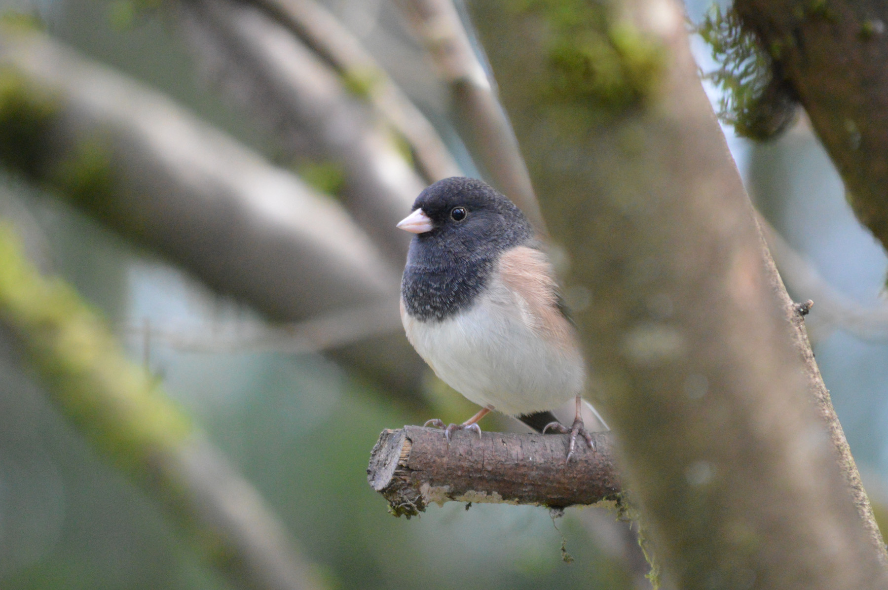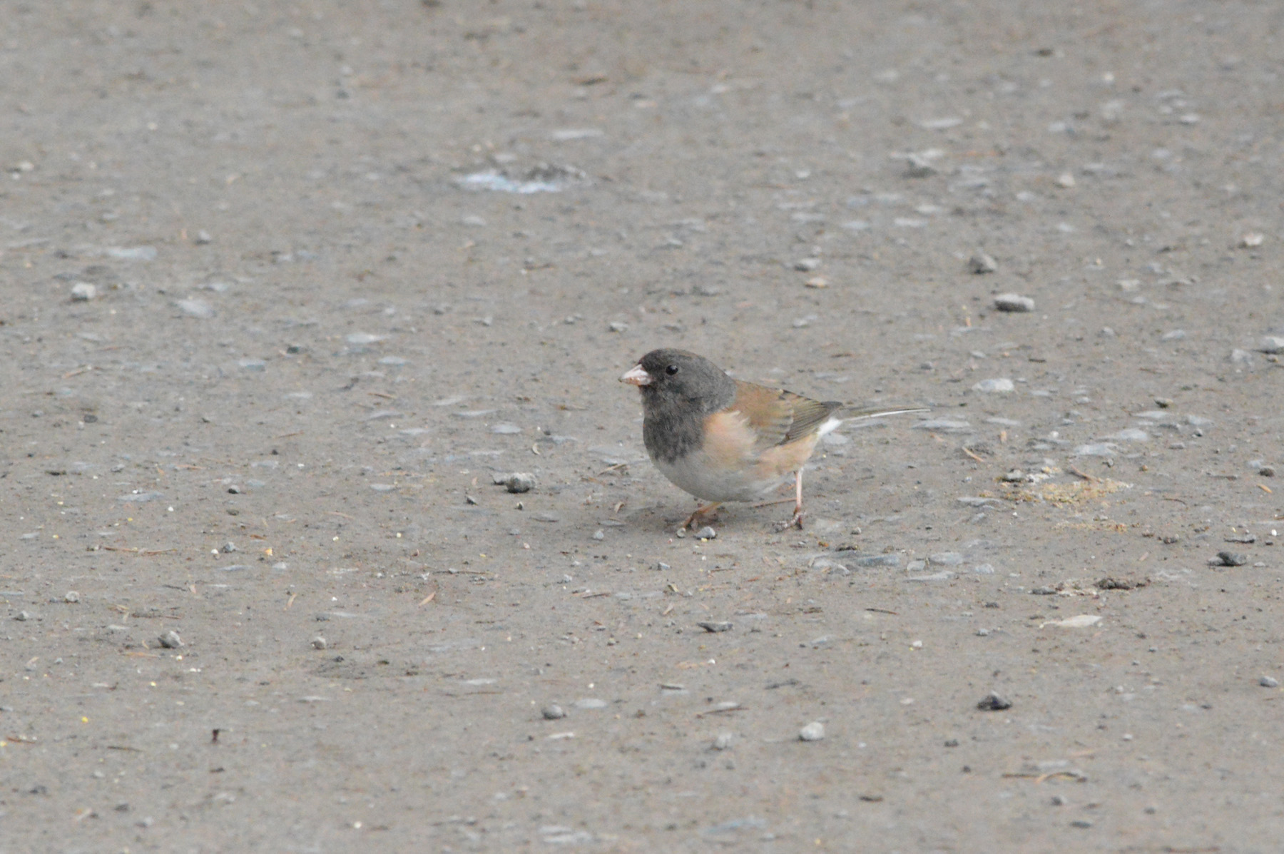 FACT: “When foraging, Dark-eyed Juncos typically hop (rather than walk) on the ground, pecking or scratching at the leaf litter, or flit very low in underbrush gleaning food from twigs and leaves. They sometimes fly up from the ground to catch insects from tree trunks. In flight, they flap continuously and pump their tails so the white outer tail feathers flash; flight is very agile as the bird maneuvers through its tangled environs. ” [allaboutbirds.org]